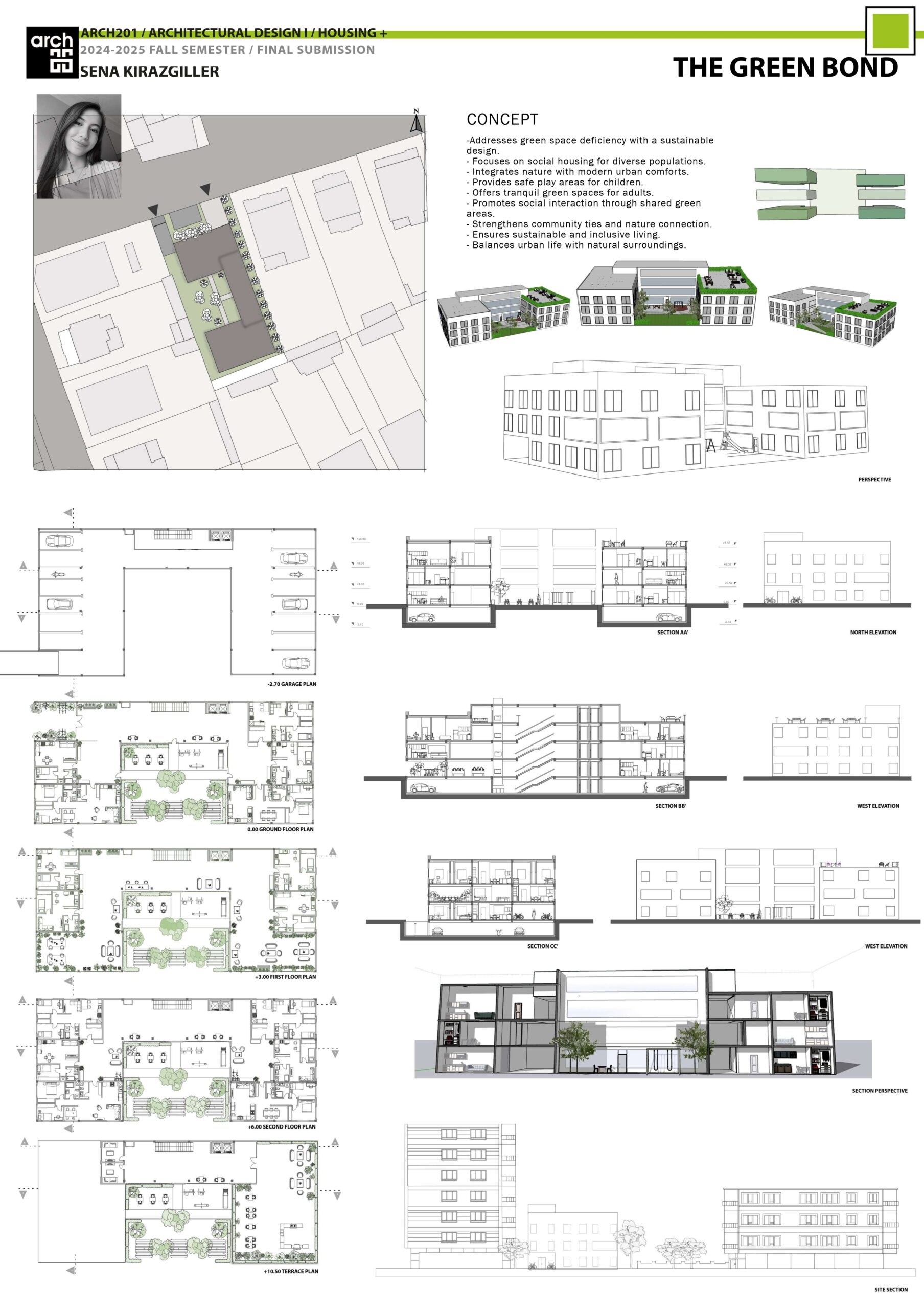 My project focuses on solving the lack of green spaces in cities by designing housing that blends nature with modern living. The idea, called “The Green Bond,” creates a balance between urban life and the environment. The design includes social housing for different groups of people, with features that support both community connections and sustainability.