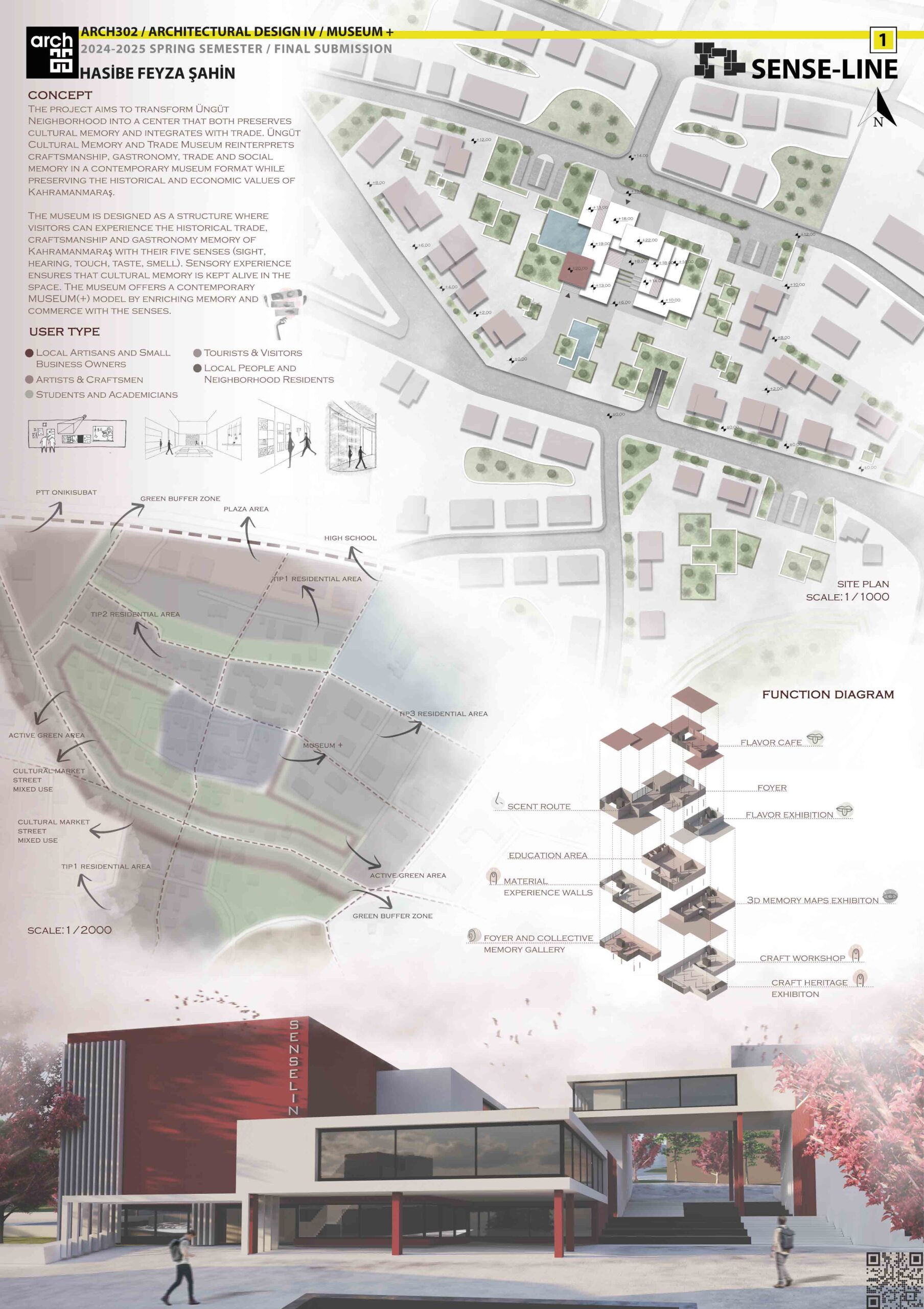 The “Sense-Line” project aims to transform Kahramanmaraş’s Üngüt Neighborhood into a multifunctional public center integrated with cultural heritage. With the trade route around the museum, this center; preserves the handicrafts, taste, smell and material memory of the past, and brings users together with an active sensory experience. Museum+ goes beyond the classical exhibition concept and offers an interactive and experience-oriented structure that makes the visitor a part of the memory.