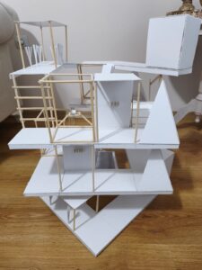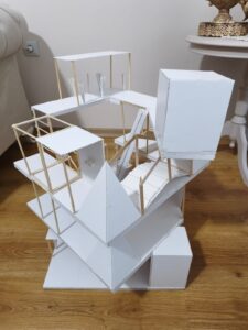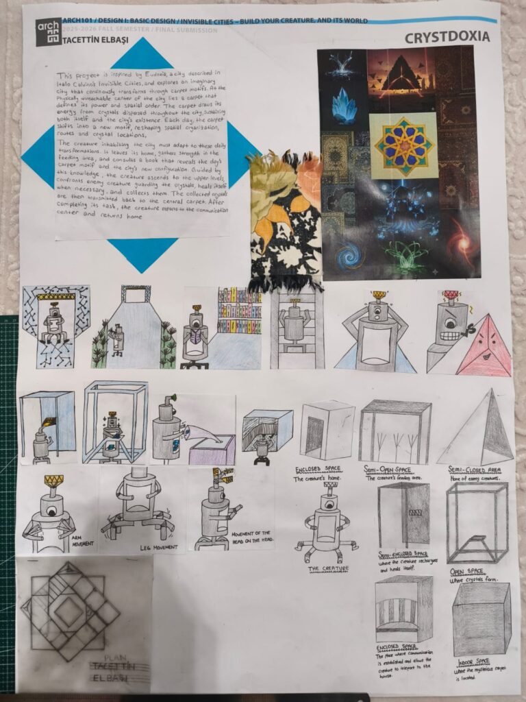 Crystdoxia is a speculative architectural city based on constant change. The project focuses on the idea that a city does not need to be clear or readable at first sight. Instead of a fixed form, Crystdoxia is designed as a system where meaning appears only when the city is observed as a whole. From inside, the city feels fragmented and confusing, but from above, an order becomes visible. At the center of the city, there is a carpet that acts as the main organizing element. The carpet cannot be physically reached, yet it controls the structure of Crystdoxia. Every day, the carpet transforms into a different motif. This motif determines how the city is arranged on that day. Buildings, paths, and empty spaces gain meaning according to this pattern. In the physical model, this idea is represented with a form that resembles a Seljuk star when viewed from above. This motif changes daily according to the carpet’s transformation. The carpet needs energy to transform, and this energy comes from crystals spread across the city. Crystals allow the carpet to change its motif and keep the city alive. Without enough energy, the city cannot reorganize itself and remains a collection of disconnected parts without clear meaning. There is only one creature capable of understanding this system. At the beginning of each day, the creature reads an ancient book located within the city. As it studies the pages, it notices how paths and spaces have shifted. For a moment, it hesitates, unsure which direction to take. Slowly, it begins moving through the city, observing the pattern, finding the crystals, and understanding the new order. The atmosphere of Crystdoxia is shaped by uncertainty  and continuous transformation, requiring the city to be reinterpreted each day rather than memorized by users.
