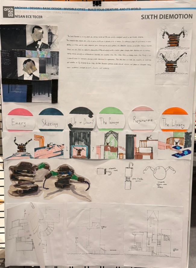 Sixth Diemotion is a speculative city designed as a spatial extension of memory, emotion, and accumulated knowledge. The city belongs to Adelma, not as a physical territory but as an inner archive shaped by lived experiences. At the center of this system exists The Keeper, a creature responsible for collecting, storing, and regulating Adelma’s information and emotional residues. Rather than acting as a destructive force, The Keeper functions as a stabilizer that maintains continuity within the city. The urban structure of Sixth Diemotion is organized around the daily routines of The Keeper. Spaces are not defined by conventional human programs but by repetitive actions such as entering, moving, pausing, ascending or descending, regenerating and observing. These actions are translated into architectural sequences that create a fluid circulation system. As a result, spatial hierarchy remains unstable; boundaries between up and down, interior and exterior, and transition and destination are intentionally blurred. Each programmatic zone, Entry, Skating, The Elevator, Passage, Regeneration Area and Library represents a different mode of interaction between memory and space. The Library functions as a storage field where collected information and emotions are layered rather than categorized. Regeneration spaces allow the city to adapt and reorganize itself according to the Keeper’s activity, emphasizing responsiveness over permanence. Sixth Diemotion challenges human-centered urban design by proposing a city that adapts to presence instead of controlling it. Architecture becomes reactive rather than dominant, shaped by routine rather than authority. Through this approach, the project explores coexistence, emotional accumulation and non-linear memory as active forces in spatial production, offering an alternative understanding of how cities can be formed, experienced and sustained. So; time is non-linear within Sixth Diemotion. Surfaces respond to movement, materials record repeated actions and silence functions as data. Spaces may shift without warning, yet memory remains the city’s only constant reference.