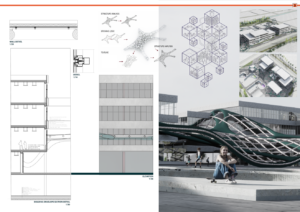 Social Catalyst & Hybrid Functions Breaking the monotony of traditional office typologies, SUB URBAN dedicates its ground plane entirely to civic engagement. The program integrates a climate-responsive bus stop—acting as a transit gateway—and a dynamic urban skatepark, which utilizes the site’s topography to attract youth and energize the public realm 24/7. These active zones are woven together by the canopy, ensuring that the space remains a social condenser even outside of office hours.